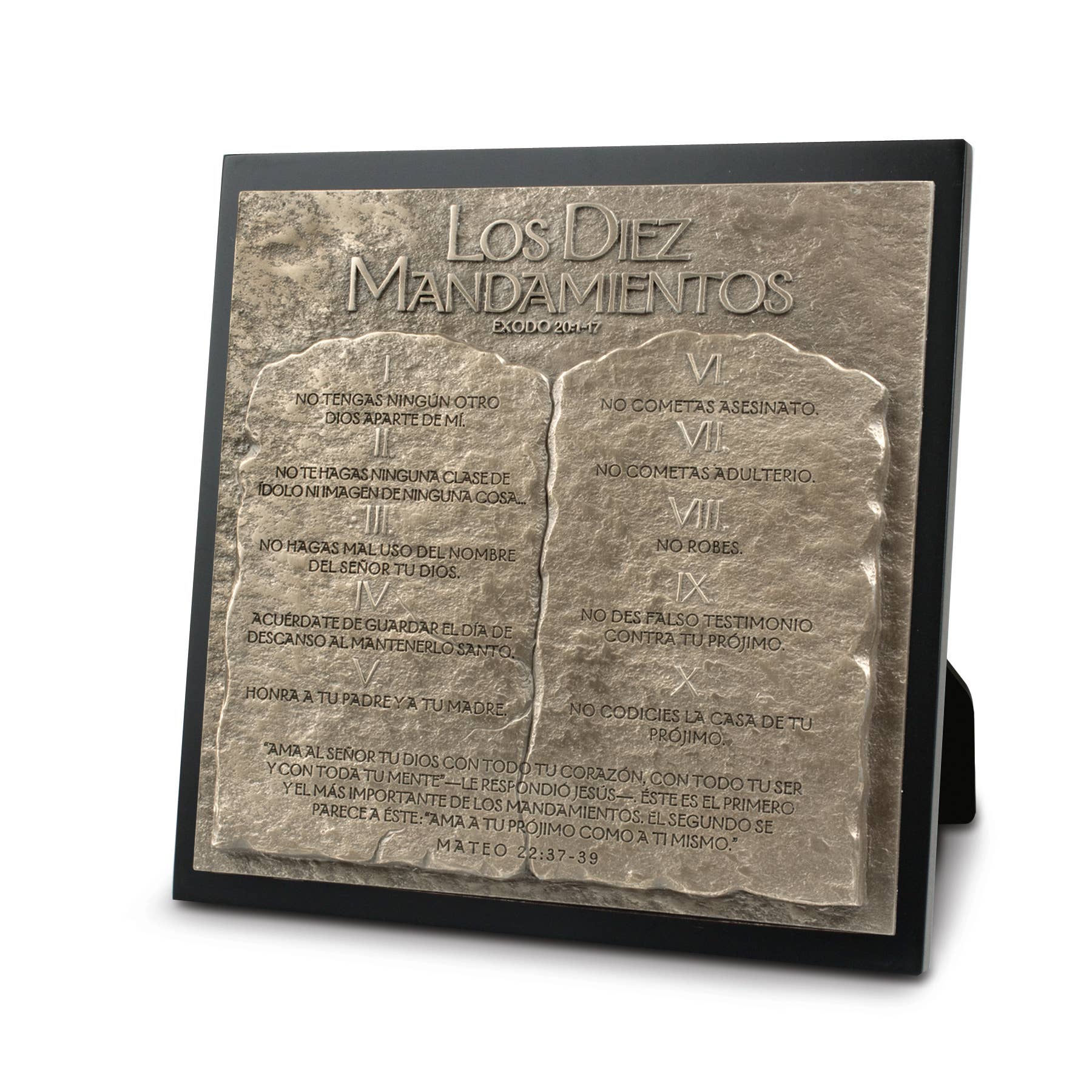 Los Diez Mandamientos. In Metallic Tones, This Stunning 3D Sculpture Plaque Depicts The Stone Tablets With The Ten Commandments Given To Moses On The Mountain. These Commands Are Given To Us In Love, That We May Know What It Is To Walk With God. To Have Right Relationship With Him. We All Fall Short, But God Is Always Waiting To Hear Our Repentant Heart. He Forgives With Love And Mercy. Always Ready To Start Anew. This Gift Makes A Difference. Through Partnership With The Nonprofit, A Better Life For Kids, Orphans And Children With Special Needs Are Given Healthy Meals, Clean Water, Safe Housing, And Education Opportunities In Ghana, Africa. Material: Resin/MDF. Size: 8 3/4 x 1 x 8 3/4 In