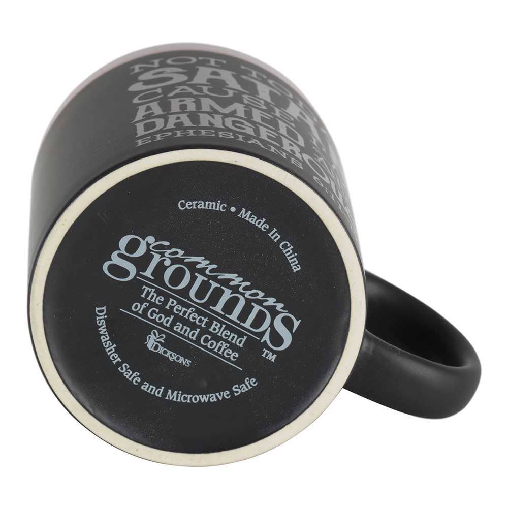Not Today Satan Chalkboard Stoneware Mug. This mug has a black chalkboard finish on the outside. Printed front and back with "Not today Satan cause I'm armed and dangerous" along with Ephesians 6:11-17 verse reference. Top rim and inside of mug have glazed finish that matches the printing. (Mug does not come with chalk, but non-printed areas could be written on with your own chalk.) Mug holds about 11 ounces; height is 3 3/4 and diameter at top is 3 1/8". Dishwasher and microwave safe.